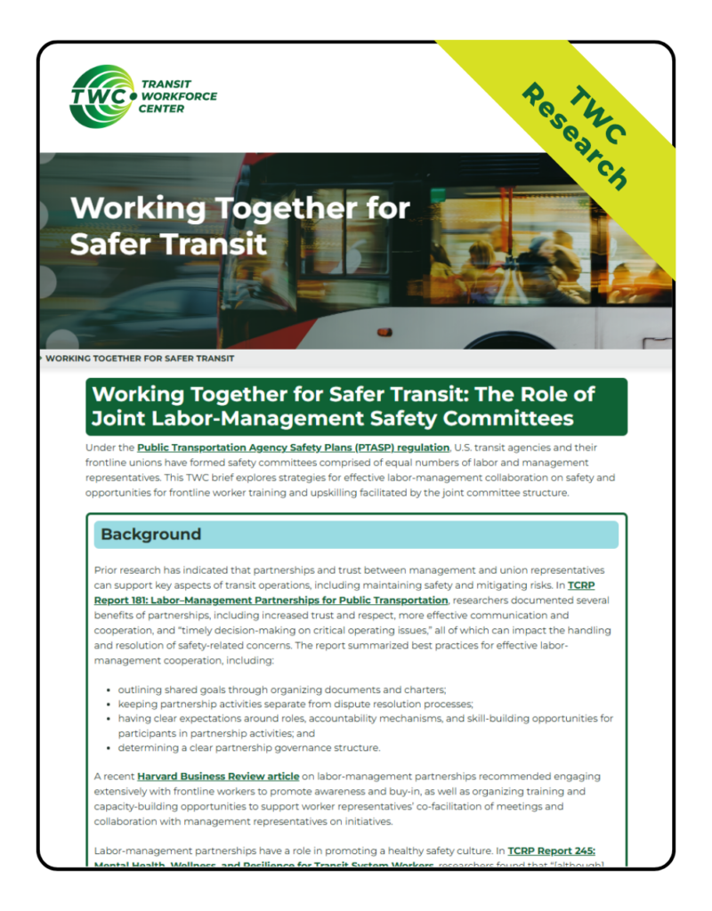 Under the Public Transportation Agency Safety Plans (PTASP) regulation, U.S. transit agencies and their frontline unions have formed safety committees comprised of equal numbers of labor and management representatives. This TWC brief explores strategies for effective labor-management collaboration on safety and opportunities for frontline worker training and upskilling facilitated by the joint committee structure.