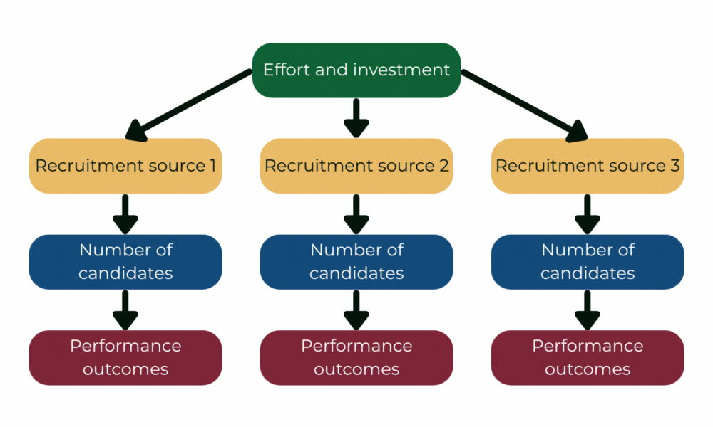 Source of hire (i.e., how an applicant heard about or was recruited for the position) is a key metric that can help agencies understand where their best applicants are coming from. Effective recruitment sources can include employee referrals, ad campaigns, conferences, or job fairs. Seeing which sources produce the most candidates or the highest performing candidates, as well as tracking the costs associated with each source, can help decision-makers at an agency determine where to continue investing time and resources. For example, if an analysis of recruitment sources reveals that employee referrals have been most effective at producing successful candidates, the agency might consider options like referral bonuses to further encourage this practice, which could lead to cost-saving in other avenues that are less effective.
